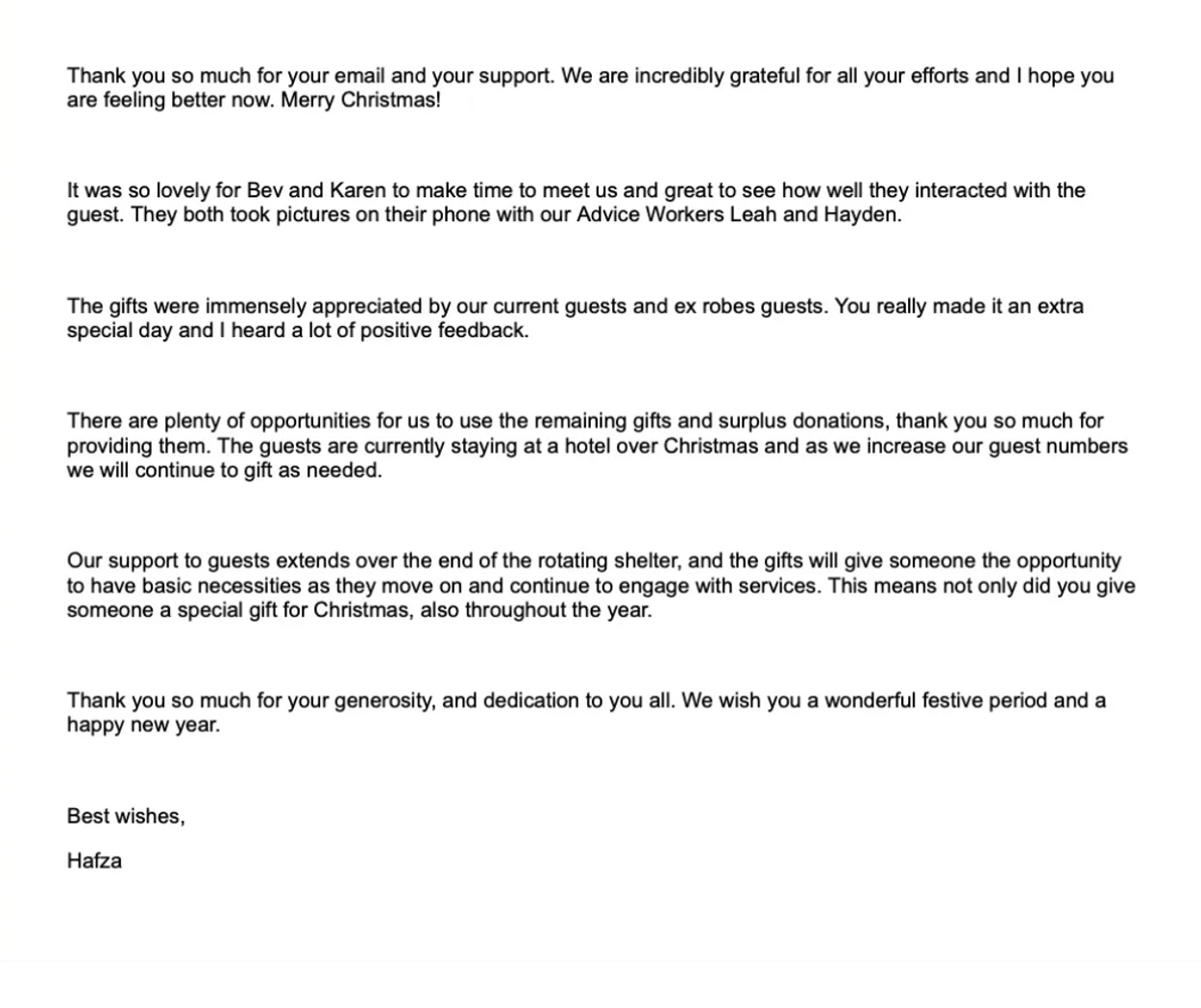 We will be giving decorated shoeboxes filled with toiletry items, warm socks, hats, scarves, gloves, chocolates and a gift card to the homeless men and women who will be staying at the Robes shelter throughout the Christmas week, as well as those who will be attending their Christmas Dinner.